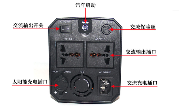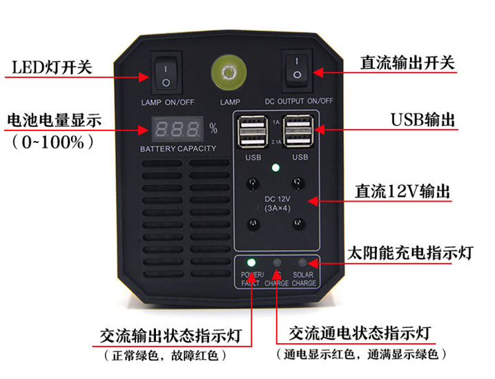 (2)本產品通過內置電源轉換器把鋰電池和交流市電轉換成交流220V/50HZ 或110V/60HZ 500W 修正正弦波/純正弦波輸出;產品帶有4個USB充電口,輸出電流高達6A;帶有4個12V輸出口,輸出電流高達10A;帶有1個8字市電輸入口,可為本產品充電和為負載供電;帶有1個太陽能充電輸入口,方便戶外時通過太陽能或者汽車點煙器為本產品充電;還有2個多功能交流輸出口,可以接駁總功率500W以內的交流負載;特別適用于移動辦公、通訊、應急設備的供電及充電;適合各品牌手機、電視機、節能燈、電風扇、手電鉆、筆記本電腦、數碼電器類產品如:便攜式攝影機,數碼像機,DVD等。